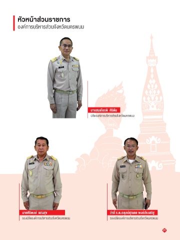หัวหน้าส่วนราชการ องค์การบริหารส่วนจังหวัดนครพนม นายสมเกียรติ ศิริตัน ปลัดองค์การบริหารส่วนจังหวัดนครพนม นายศิริพงษ์ แสนสุข ว่าที่ ร.ต.อดุลย์ศุภเดช พงษ์ประเสริฐ รองปลัดองค์การบริหารส่วนจังหวัดนครพนม รองปลัดองค์การบริหารส่วนจังหวัดนครพนม 21