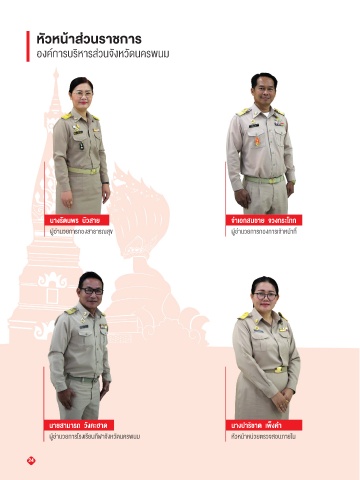 หัวหน้าส่วนราชการ องค์การบริหารส่วนจังหวัดนครพนม นางรัตนพร บัวสาย จ่าเอกสมชาย จวงกระโทก ผู้อ�านวยการกองสาธารณสุข ผู้อ�านวยการกองการเจ้าหน้าที่ นายสามารถ วังคะฮาด นางปาริชาต เพ็งค�า ผู้อ�านวยการโรงเรียนกีฬาจังหวัดนครพนม หัวหน้าหน่วยตรวจสอบภายใน 24