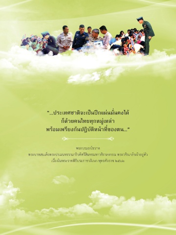 “...ประเทศชาติจะเป็นปึกแผ่นมั่นคงได้ ก็ด้วยคนไทยทุกหมู่เหล่า พร้อมเพรียงกันปฏิบัติหน้าที่ของตน...” พระบรมราโชวาท พระบาทสมเด็จพระปรเมนทรรามาธิบดีศรีสินทรมหาวชิราลงกรณ พระวชิรเกล้าเจ้าอยู่หัว เนื่องในพระราชพิธีบรมราชาภิเษก พุทธศักราช ๒๕๖๒ 3