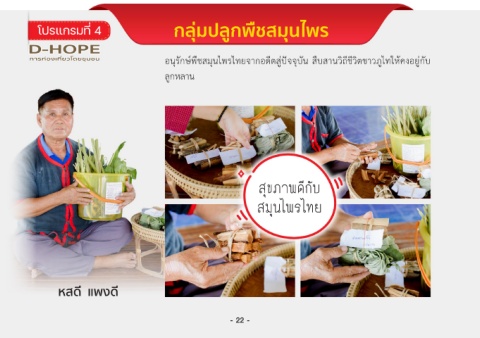 โปรแกรมที่ 4 กลุ่มปลูกพืชสมุนไพร อนุรักษ์พืชสมุนไพรไทยจากอดีตสู่ปัจจุบัน สืบสานวิถีชีวิตชาวภูไทให้คงอยู่กับ ลูกหลาน สุขภาพดีกับ สมุนไพรไทย หสดี แพงดี - 22 - - 23 -