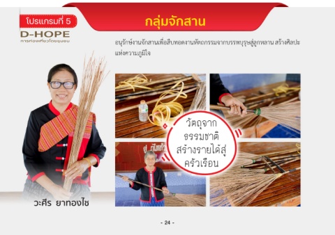 โปรแกรมที่ 5 กลุ่มจักสาน อนุรักษ์งานจักสานเพ่อสืบทอดงานหัตถกรรมจากบรรพบุรุษสู่ลูกหลาน สร้างศิลปะ ื แห่งความภูมิใจ วัตถุจาก ธรรมชาต ิ สร้างรายได้สู่ ครัวเรือน วะศีร ยาทองไช - 24 - - 25 -