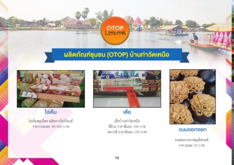 แพบ้านท่าวัด ผลิตภัณฑ์ชุมชน (OTOP) บ้านท่าวัดเหนือ ไข่เค็ม เสื่อ ไข่เค็มสมุนไพร ผลิตจำกไข่เป็ดแท้ เสื่อบ้ำนท่ำวัดเหนือ รำคำกล่องละ 50-100 บำท สีล้วน รำคำผืนละ 100 บำท ขนมดอกจอก หลำกสี รำคำผืนละ 150 บำท ขนมดอกจอกสมุนไพรแท้ รำคำถุงละ 10 บำท 10 11
