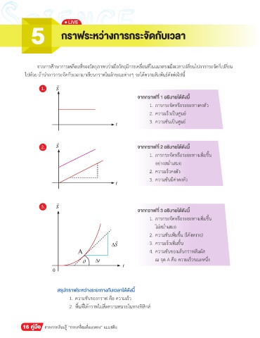 ไปด้วย ถ้าน�าการกระจัดกับเวลามาเขียนกราฟในลักษณะต่างๆ จะได้ความสัมพันธ์ดังต่อไปนี้
