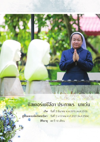 ซิสเตอร์เซชีลีอา ประภาพร นาแว่น เกิด วันที่ 3 มีนาคม ค.ศ.1976 (พ.ศ.2519) สู่อ้อมพระหัตถ์พระบิดา วันที่ 2 มกราคม ค.ศ.2021 (พ.ศ.2564) สิริอายุ 44 ปี 10 เดือน ซิสเตอร์เซชีลีอา ประภาพร นาแว่น 1