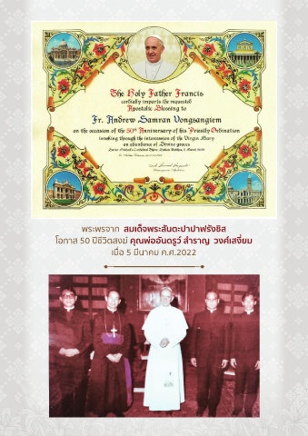 พระพรจาก สมเด็จพระสันตะปาปาฟรังซิส โอกาส 50 ปีชีวิตสงฆ์ คุณพ่ออันดรูว์ สำาราญ วงศ์เสงี่ยม เมื่อ 5 มีนาคม ค.ศ.2022